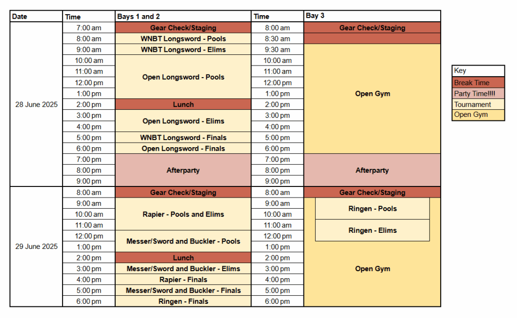 Currently planned tournaments are: Open Longsword, WNBT (women/non-binary/trans) Longsword, Rapier, experimental Sword & Buckler/Messer, and Ringen.